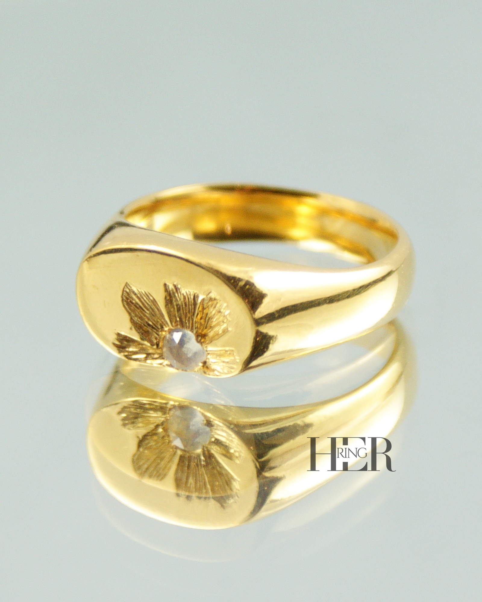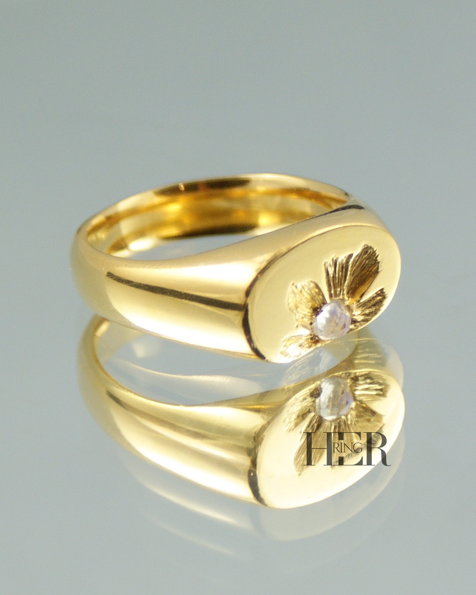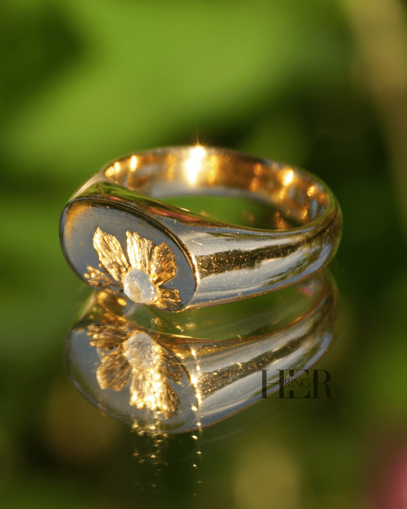Zewnętrzna część sygnetu wyróżnia się delikatnym, floralnym grawerunkiem, który przywołuje naturę w jej najczystszej formie: silną, nieidealną, wyjątkową. To hołd dla siły Twoich korzeni.