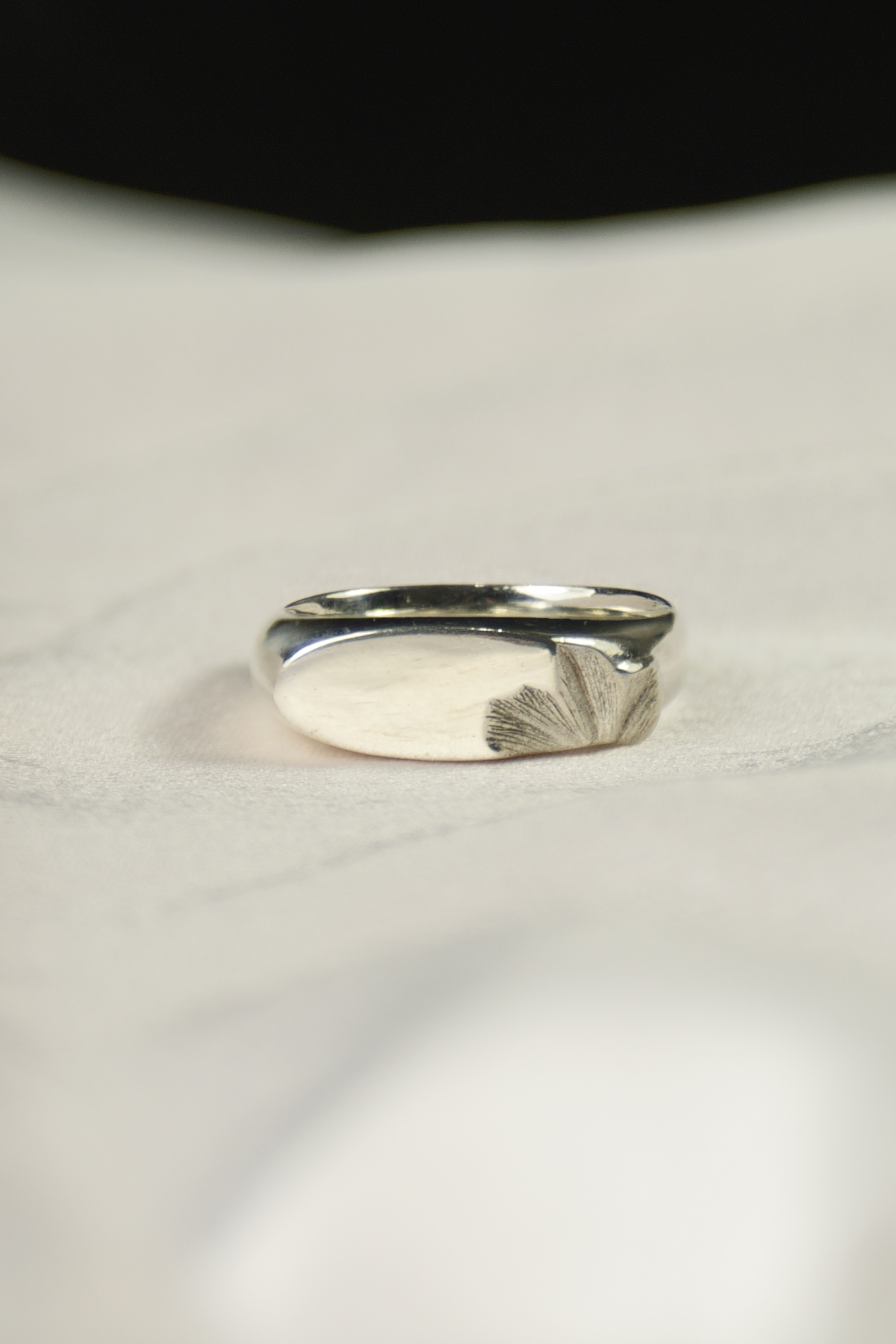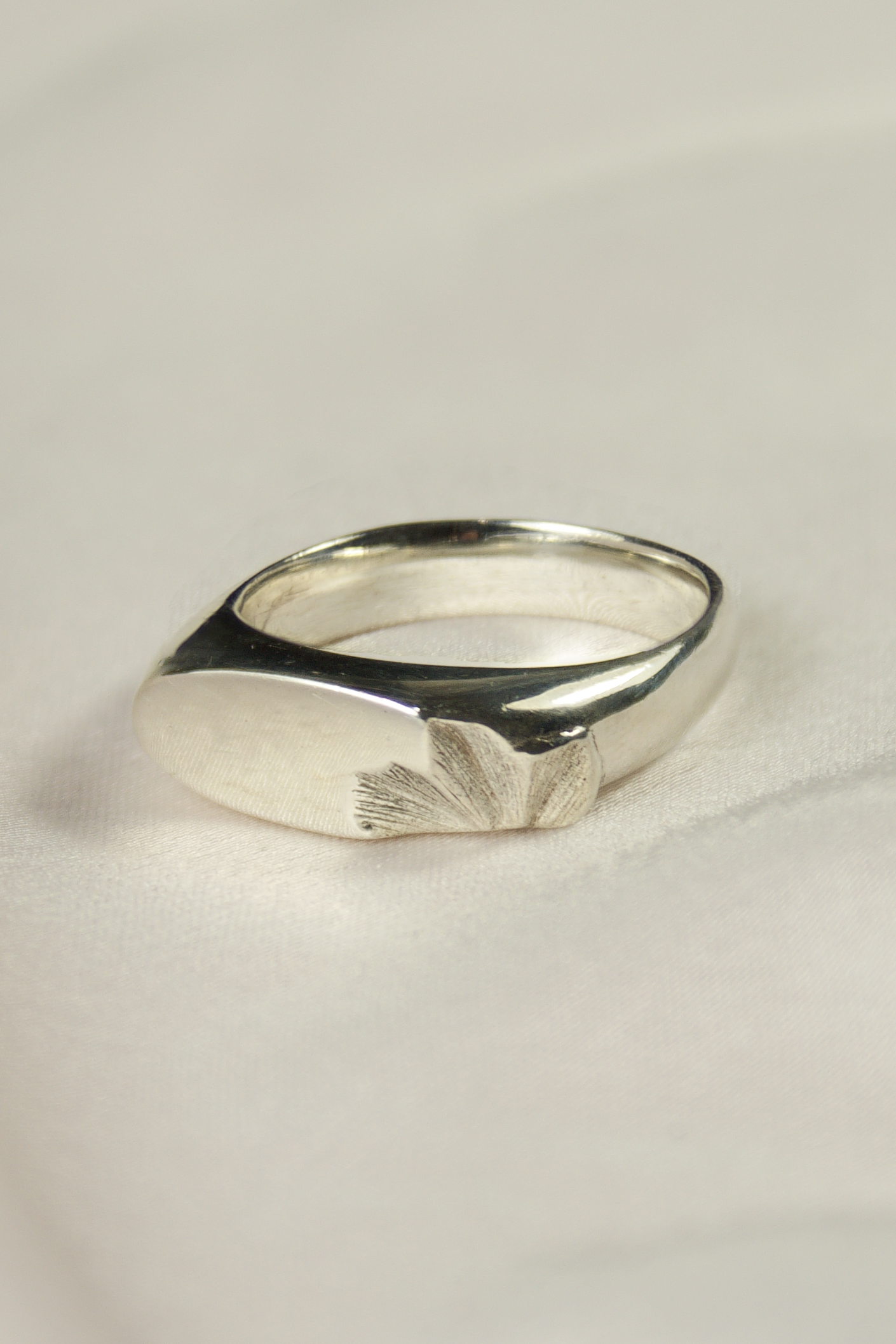 Surowe płatki: Brzegi sygnetu zdobią ręcznie wyrzeźbione płatki. Celowo pozostawiam je bez polerowania, aby zachować ich naturalny, nieco szorstki charakter – to mój ukłon w stronę tradycyjnych technik złotniczych.