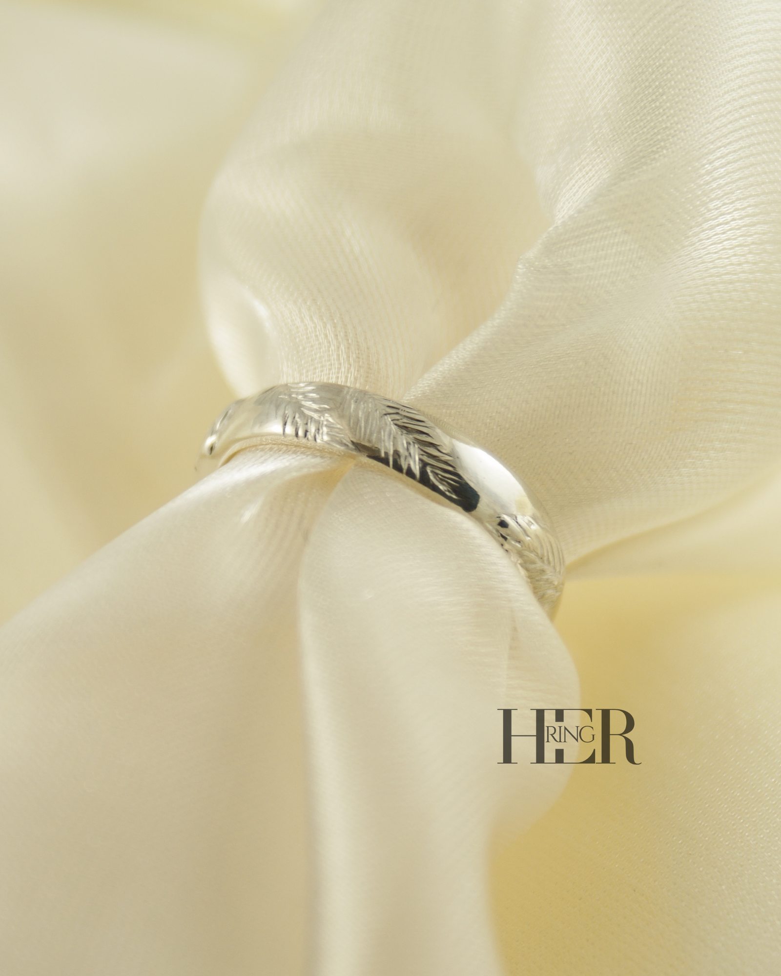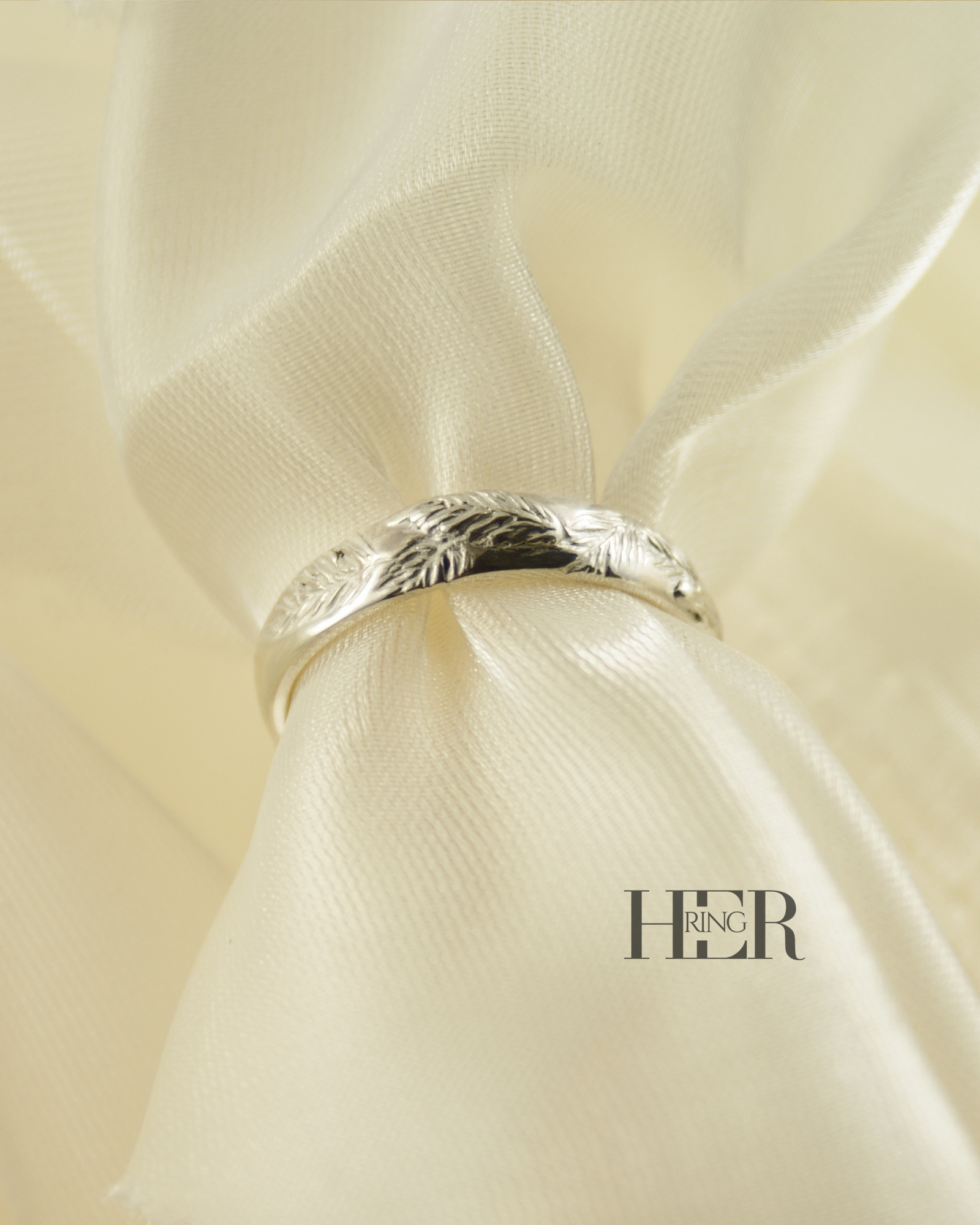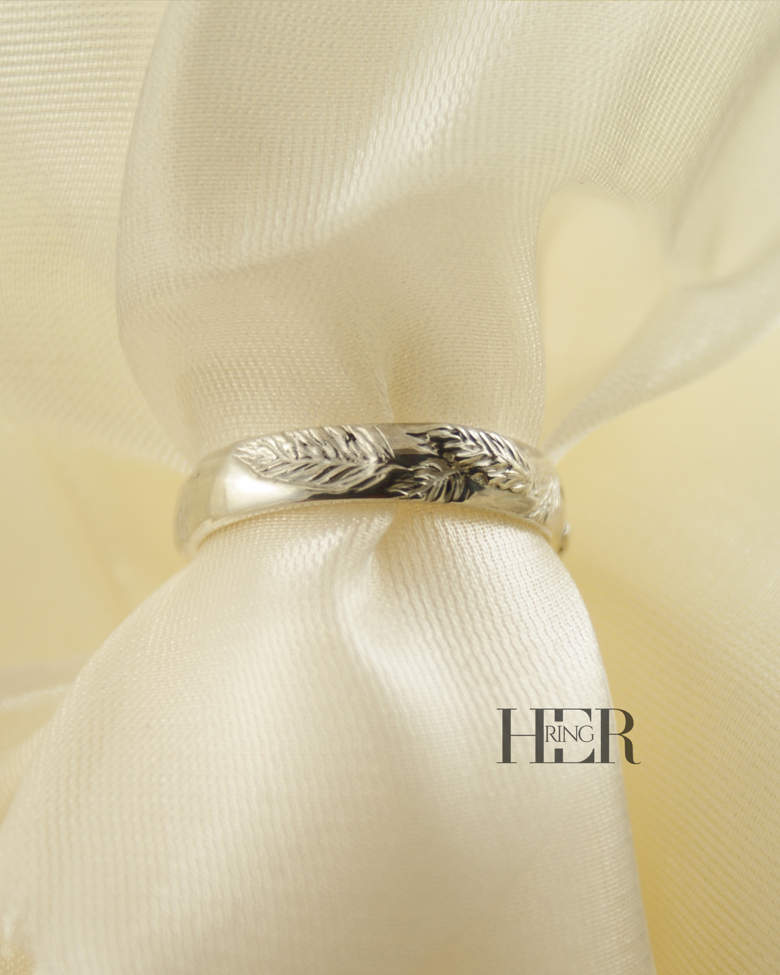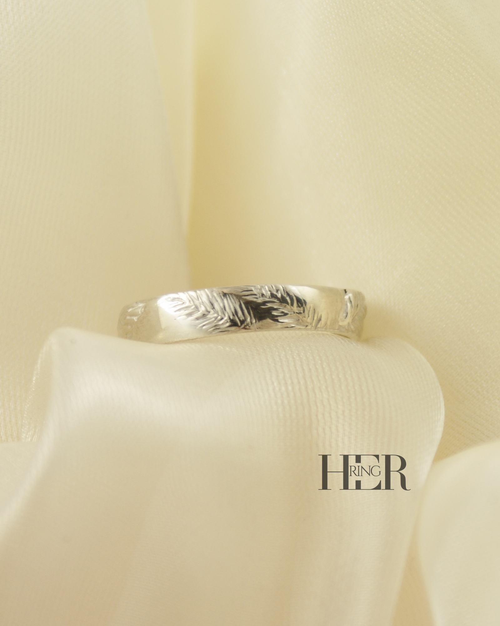 Zewnętrzna powierzchnia obrączki została ukształtowana w formie rzeźbionego motywu liści i igliwia. Struktura nie została nadmiernie wygładzona, dzięki czemu zachowany jest naturalny, surowy charakter wzoru oraz czytelność detalu.