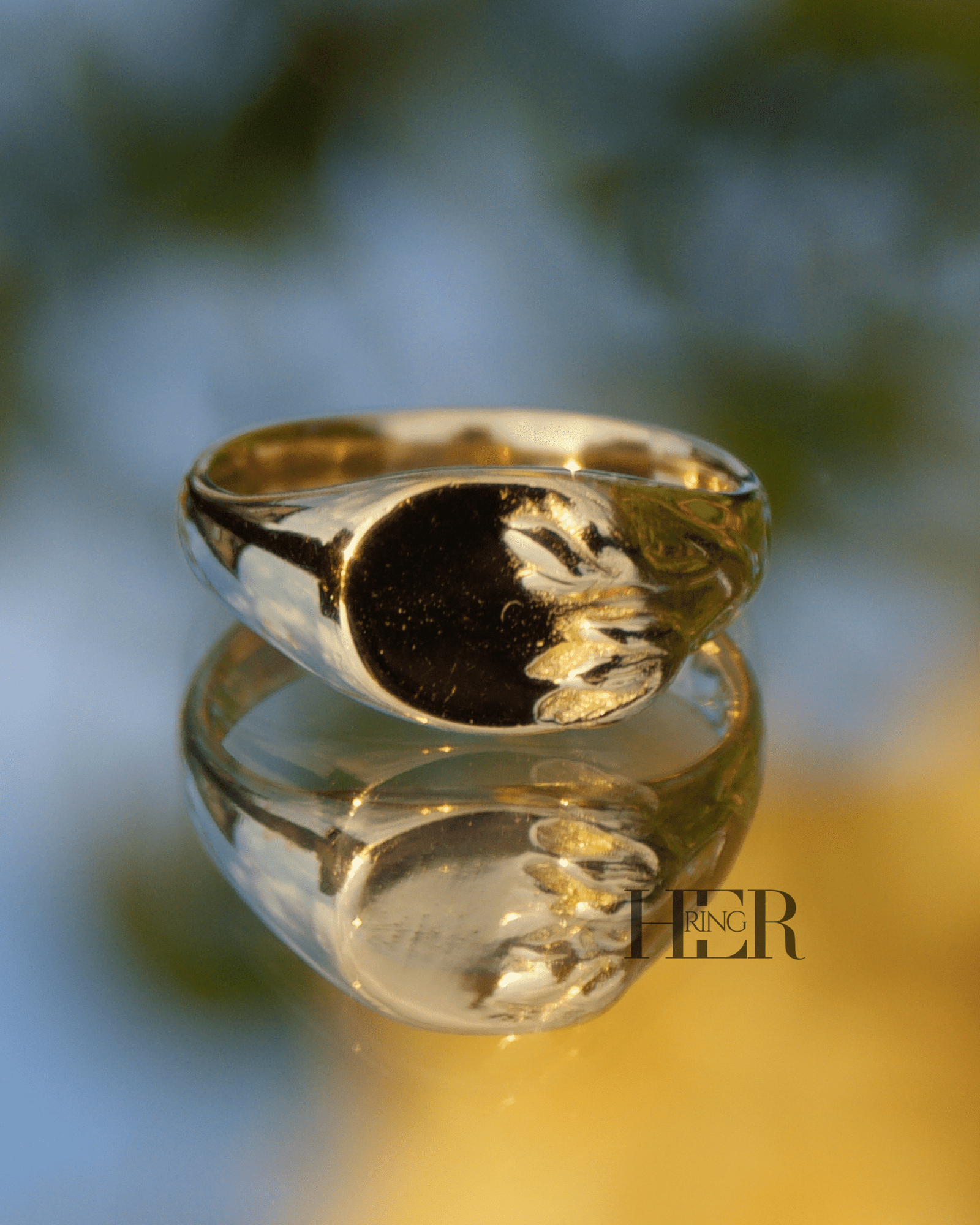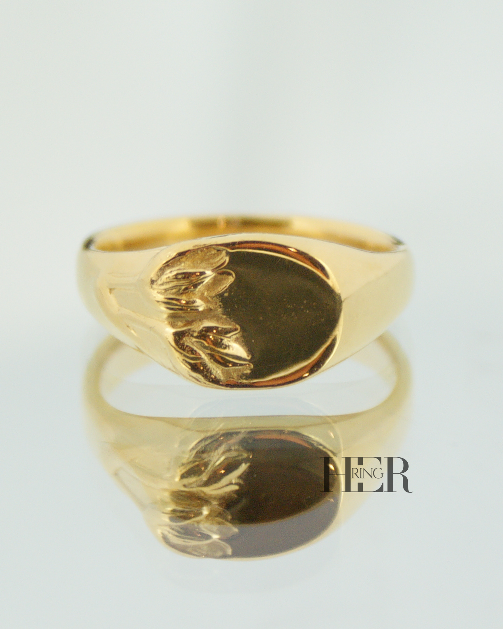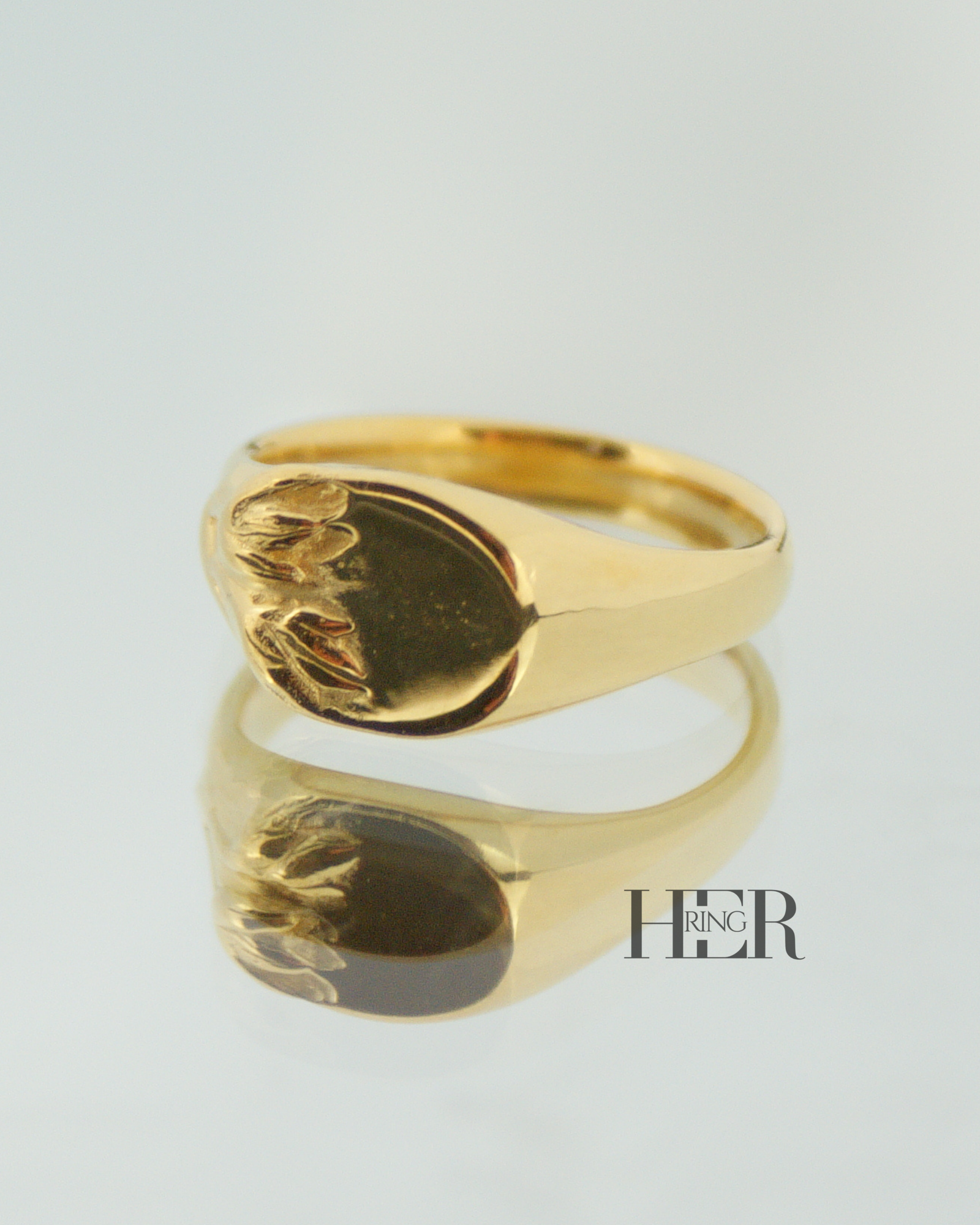 Z drugiej strony, na górze sygnetu znajduje się gładka, płaska tafla. Tafla ta czeka na personalizację. Dzięki temu możesz umieścić na niej monogram, inicjał, symbol afirmacyjny lub krótką myśl, którą chcesz nosić blisko siebie. W ten sposób Tulipa staje się Twoją osobistą przestrzenią.