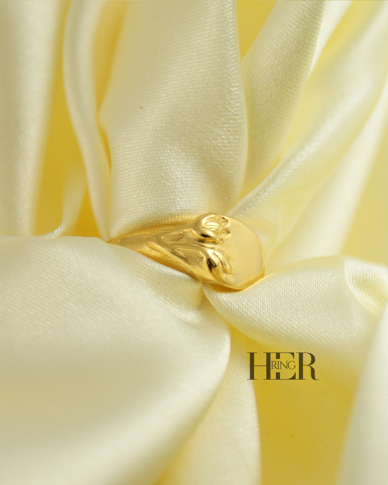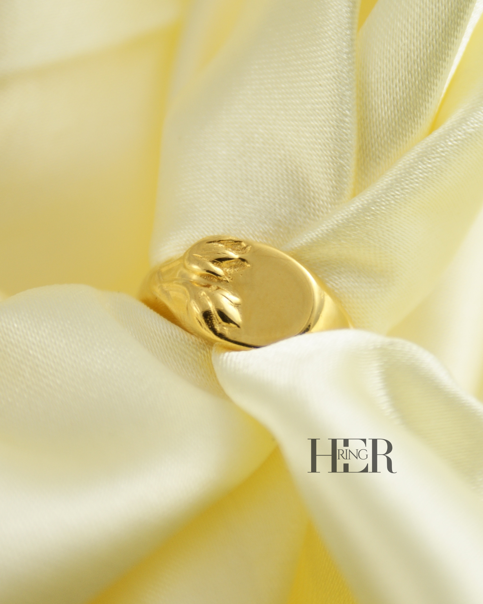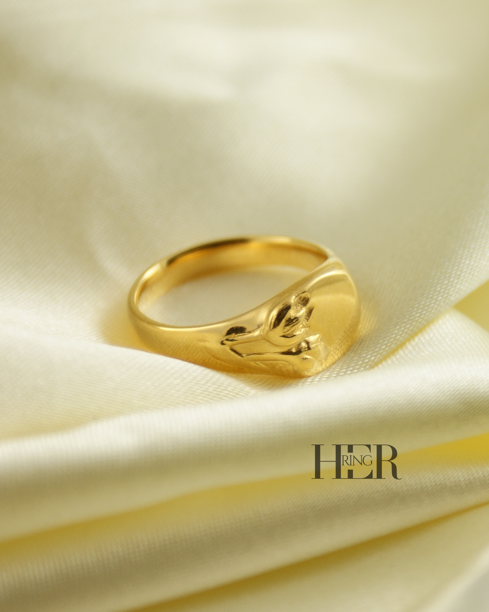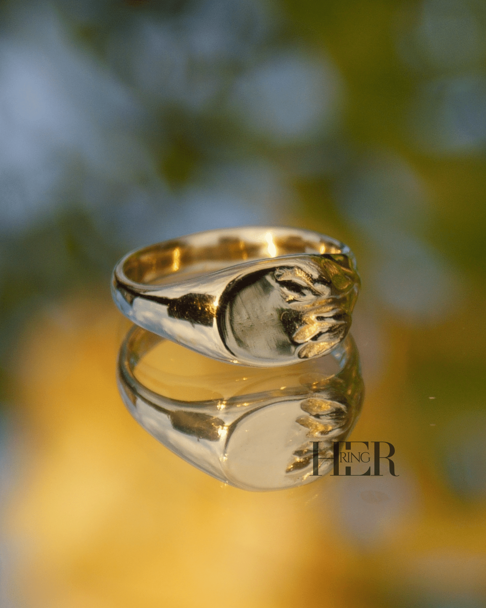 Z drugiej strony, na górze sygnetu znajduje się gładka, płaska tafla. Tafla ta czeka na personalizację. Dzięki temu możesz umieścić na niej monogram, inicjał, symbol afirmacyjny lub krótką myśl, którą chcesz nosić blisko siebie. W ten sposób Tulipa staje się Twoją osobistą przestrzenią.
